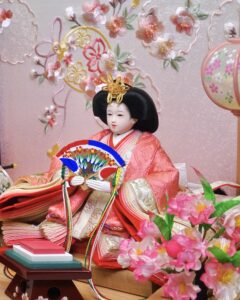 お雛様のお着物や屏風・お道具類に桜の花をあしらった、春の気配がいっぱいの親王飾りです。