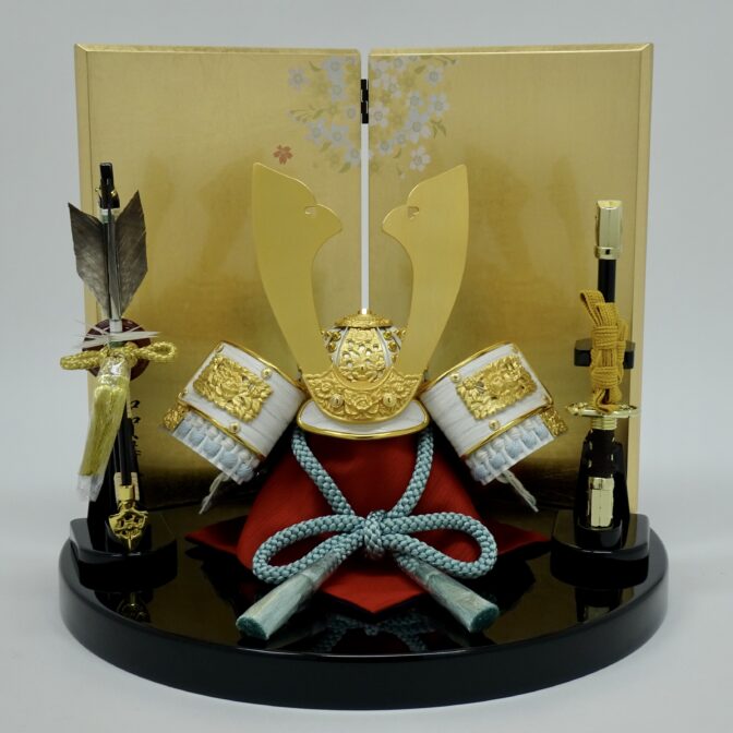白と水色を基調とした爽やかな色彩の兜を桜を描いた金の二曲屏風にセットしました。