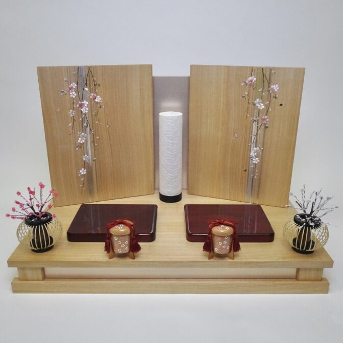 飾り台と屏風には自然素材を取り入れ金彩で枝垂れ桜を描き、あたたかな雰囲気に仕上げました。